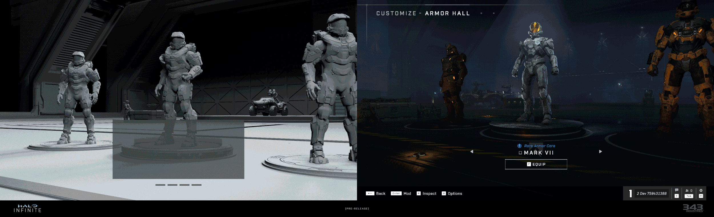 Leveraging the previsualization seen above, we reached out to one of our co-development studios to partner on building out a code-based, dynamic camera system. This served as the foundation of the space in which we would ground the realization of our military-focused Customization Hangar. Creating these dioramas was a highly collaborative, cross discipline exercise between Realization, UX/UI, World Building, Lighting, FX, Development, Animation, and more, but none of this would have been worthwhile without the amazing equipment that was beautifully modeled and textured by our Character, Equipment, and ECT teams. Below are a few UI-less selects of the various spaces I had the opportunity to collaborate on circa Infinite’s initial release.